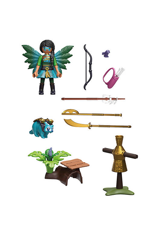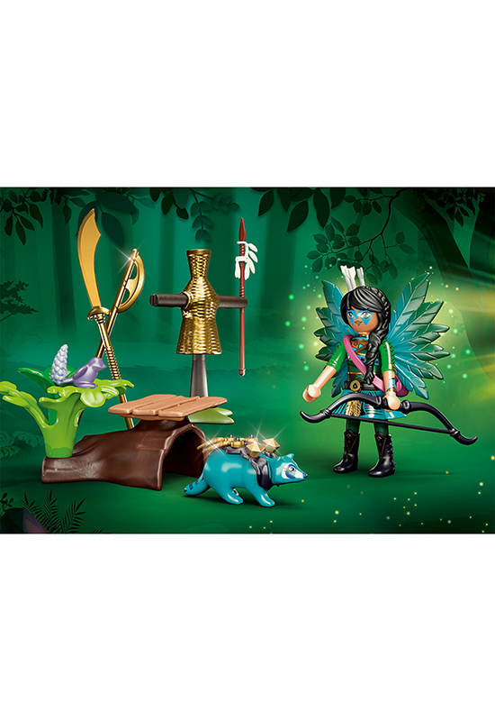 In the magical fairy forest of Ayuma, the Knight Fairies ensure peace and harmony. With her spirit animal raccoon, the courageous Knight Fairy sets out to see if things are all right in the forest. Should a Bat Fairy approach, she has her spear and bow and arrow ready to hand. As a Knight Fairy, she is always well prepared because she is always training diligently on the training dummy. PLAYMOBIL Starter Packs are ideal as a start or as an addition to the many colorful PLAYMOBIL play worlds. The set includes a Knight Fairy with detachable leafy wings, spear, battle axe, longsaber and many other extras for exciting fairy adventures. The silicone skirt can be put on and taken off the figure. size 25 x 7 x 14 cm