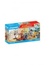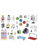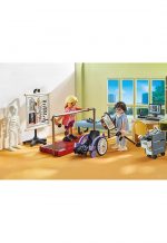 In orthopedics, the patient practices walking with her new prosthesis — naturally under the watchful eyes of her specialist. Complete with wheelchair, walking stick, examination bed, removable tape bandages, and many other accessories for successful treatment. Perfectly combinable with other Action Heroes Hospital Sets from PLAYMOBIL.