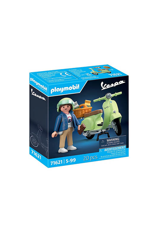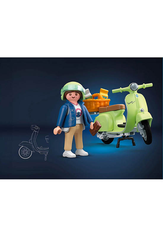Saddle up on 1969 Vespa 150 Sprint Veloce in light green by PLAYMOBIL! Inspired by the Piaggio scooter model Vespa 150 Sprint Veloce, this authentic PLAYMOBIL Vespa combines charm with timeless elegance. The lovingly designed Vespa is complemented by a PLAYMOBIL figure and a variety of accessories. Groceries and wallet can be stored in the basket behind the seat. With the various saddle variants, with and without a figure seat, the scooter can be customized. Whether you’re an experienced rider or a beginner, this set is perfect for children and adult Vespa fans alike. Experience the spirit of the road with the iconic 1969 Vespa 150 Sprint Veloce in light green by PLAYMOBIL!