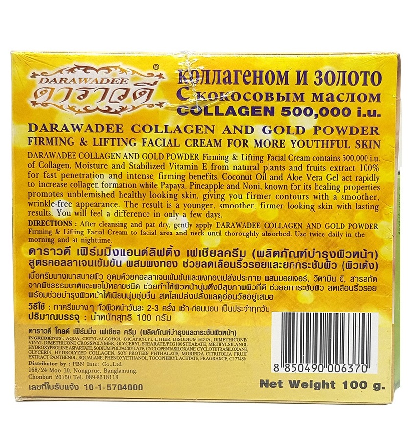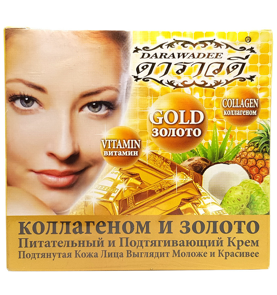 Крем для лица Darawadee Коллаген и Золото содержит 500 000 едениц коллагена, мелкодисперсный биоактивный порошок Золота и стабилизированный витамин Е, полученный из натуральных экстрактов растений и фруктов. Обладает питательным и лифтинг-эффектом.