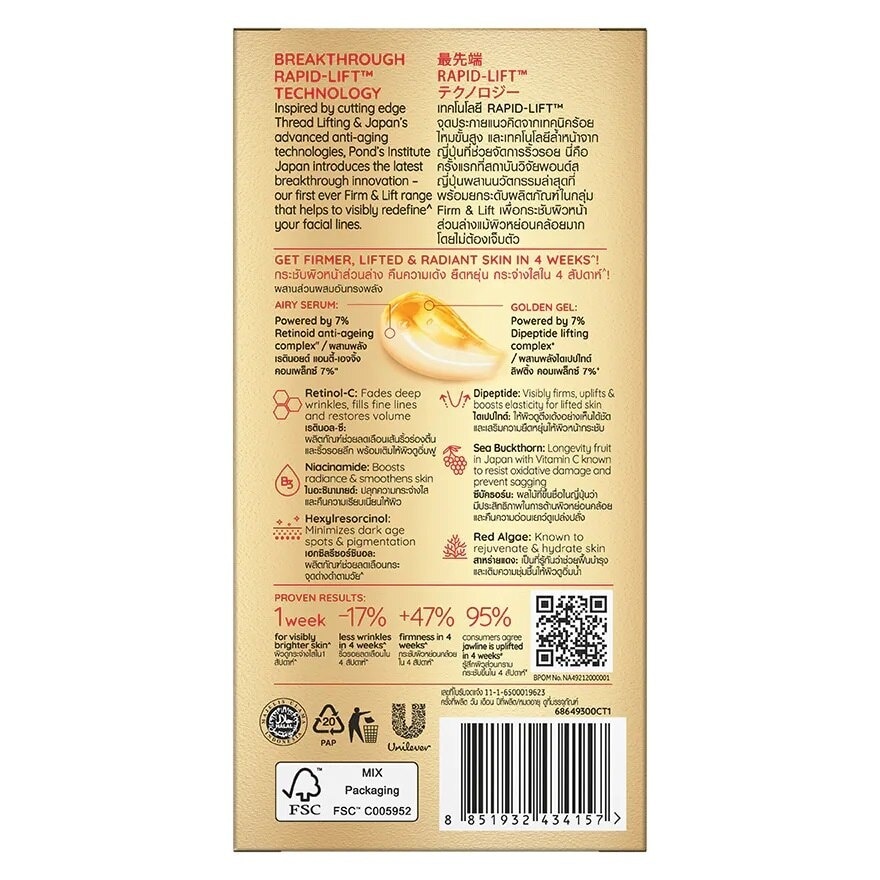 POND’S FIRM & LIFT AGE MIRACLE DOUBLE BOOSTER SERUM BREAKTHROUGH RAPID-LIFT TECHNOLOGY Inspired by cutting edge Thread Lifting & Japan’s advanced anti-aging technologies, Pond’s Institute Japan introduces the latest breakthrough innovation-our first ever Firm & Lift range that redefines your facial lines. Get Lift, firmer & radiant skin in 4 weeks AIRY SERUM, Powered by 7% Retinoid pro-aging complex — Retinol-C Fades deep wrinkles, fills fine lines and restores volume — Niacinamide Boosts radiance & smoothens skin — Resorcinol Minimises aging dark spots and pigmentation GOLDEN GEL, Powered by 7% Dipeptide lifting complex — Dipeptide Visibly firms, uplifts & boosts elasticity for lift skin — Sea Buckthorn Known as longevity fruit in Japan to rejuvenate & prevent sagging — Red Algae Known to repair & hydrate skin 99% consumers are satisfied and agree that jawline is uplifted in 4 weeks