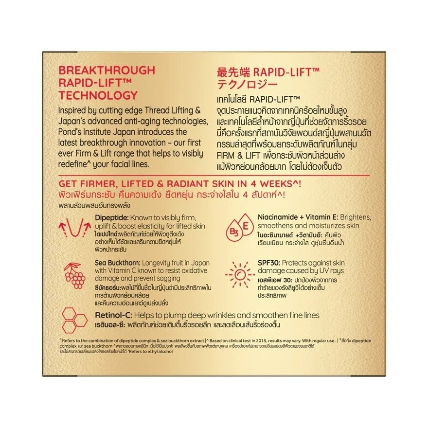 POND’S FIRM & LIFT AGE MIRACLE SCULPTING DAY CREAM SPF30 PA+++ BREAKTHROUGH RAPID-LIFT TECHNOLOGY Inspired by cutting edge Thread Lifting & Japan’s advanced anti-aging technologies, Pond’s Institute Japan introduces the latest breakthrough innovation — our first ever Firm & Lift range that redefines your facial lines. Get Lift, supple & radiant skin in 4 weeks — Dipeptide Helps to visibly firm, uplift & boost elasticity for lifted skin — Sea Buckthorn Known as longevity fruit in Japan to rejuvenate & prevent sagging — Retinol-C Helps to plump deep wrinkles and smoothen fine lines — Niacinamide + Vit E Brightens, smoothens and moisturises skin — SPF30 Strong sun protection against skin damage caused by UV rays