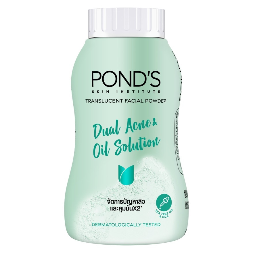 Pond’S Powder Dual Acne & Oil Solution Translucent loose powder formula to deal with acne problems and control oiliness combined with the power of tea tree oil, Centella Asiatica (Cica), Zinc, PCA, Vitamin B3 and Allantoin that help absorb excess oil on the face. Effectively deal with acne problems while helping to soothe the skin for smooth and clear skin far away from acne. Fine powder texture, light, pass the irritation test by a dermatologist, no parabens, gentle to the skin. suitable for all skin types Dealing with acne x2 , represents centella asiatica extract (Cica) and Tea Tree Oil, oil control x2 represents Talc and Sync PCA. of Pond’s powder New Acne Talcum — Dual and Double solution — Anti Acne X2 — Oil control X2 — Tea Tree Oil, Cica, Zinc PCA — Dermatologically tested — Winning concept