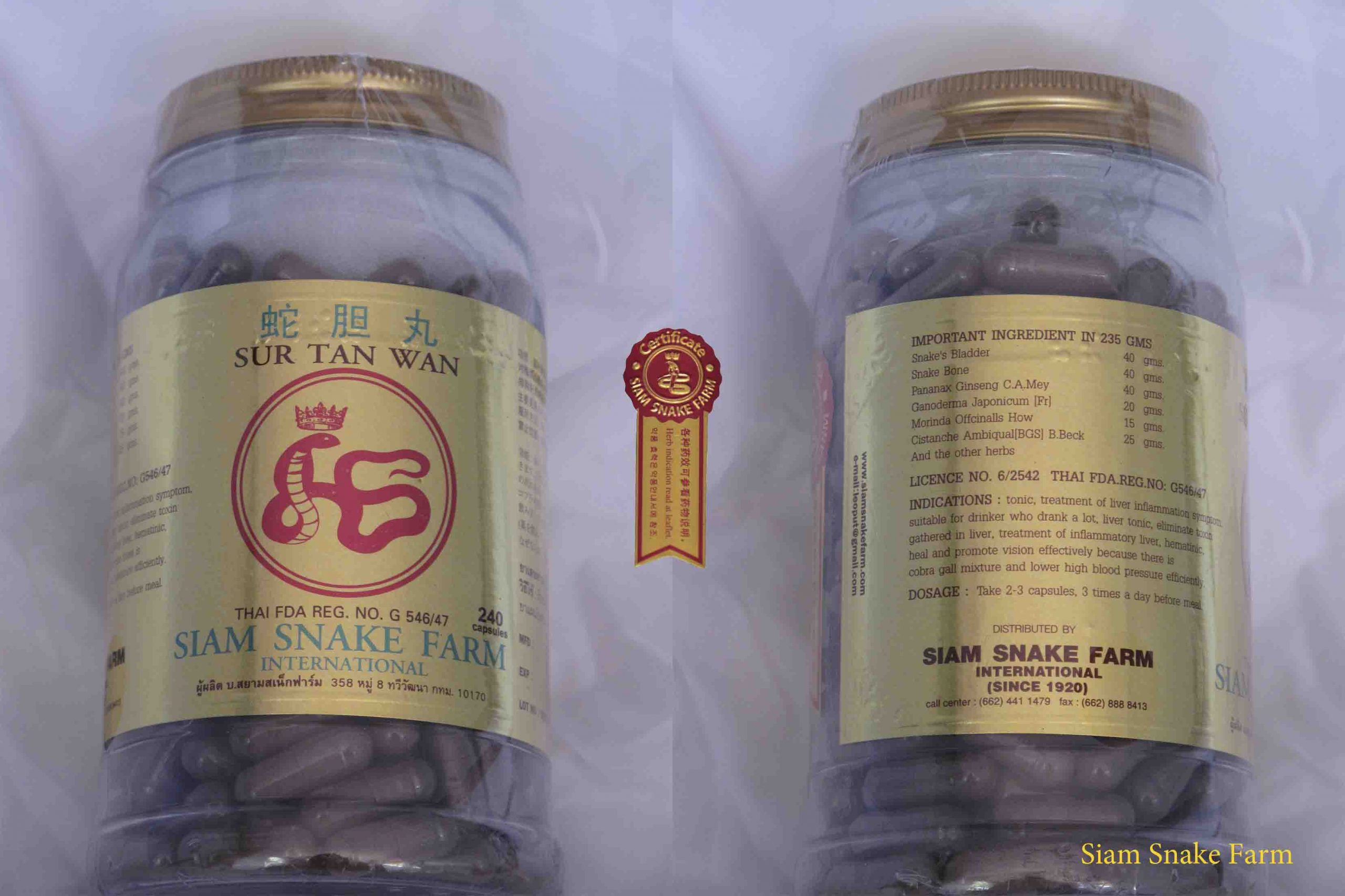 Препарат из желчного пузыря кобры Сур Тан Ван (Ya Ser Tan Wan) – это мощный биостимулятор иммунной системы и антиоксидант. Препарат изготовлен из китайских и тайских лекарственных растений (гриб рейши, женьшень, ласточкины гнезда) и желчи кобры.