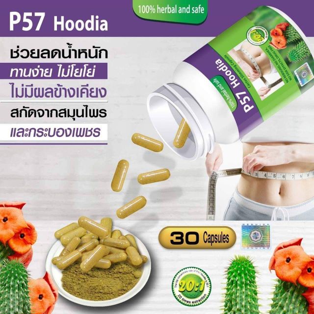 В основе препарата P57 Hoodia лежит экстракт пустынного кактуса. В ходе его разработки учёные много лет изучали поведение туземцев, обитающих в южной части африканского континента. Большую часть этой территории занимает пустыня, в которой найти пропитание крайне тяжело. Тем не менее населяющие здешние места племена умудряются выживать. В этом им помогает уникальный кактус Худия гордония. Туземцы употребляют в пищу мякоть этого растения. В результате организм восстанавливает жидкостный баланс и получает все необходимые вещества. Но самое главное — кактус Худия гордонии помогает африканцам очень долго обходиться без пищи. Содержащиеся в мякоти гликозиды подавляют аппетит, сообщая мозгу, о «сытости» организма.