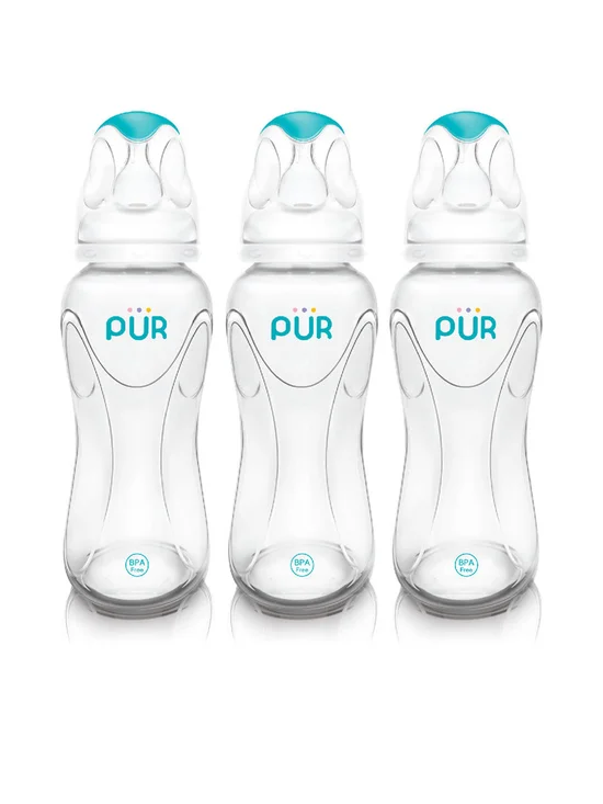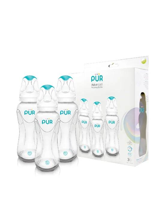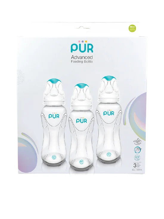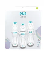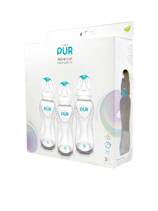 Advanced Slim Neck Bottle 8 oz from PUR brand name. Bottle is a standard Bisphenol A (BPA free), neck-free bottle with Gentle Touch teat, an «air valve» exclusive, ultra-pure. The baby is able to suckle milk consistently and continuously without worrying about flatulence Indigestion in young children.