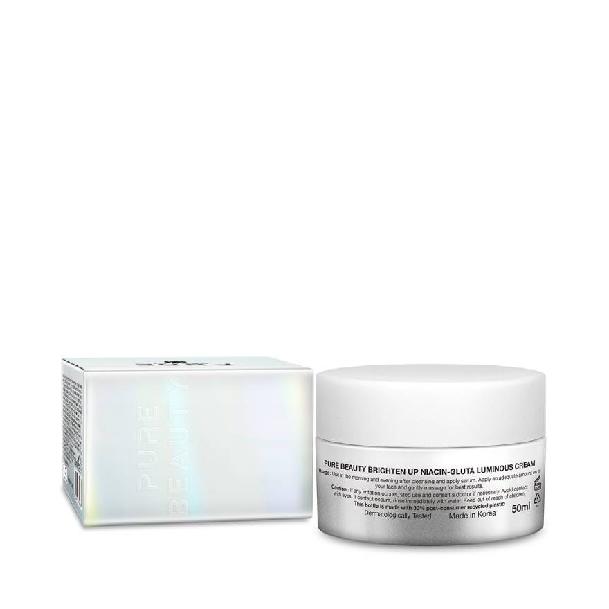 This Pure Beauty Brighten Up Niacin-Gluta Luminous Cream helps to improve clarity and brightness while also harnessing the power of 2 Niacinamide and Glutathione to improve dark spots and uneven skin tone. Its deeply moisturing formula leaves skin feeling supple and hydrated. Ingredient you can trust with a reduced environmental impact. This product was formulated without over 20 unwanted ingredients. Additionally, the bottle is also made with 50 recycled plastic and the paper used in this box packaging is certified by FSC.