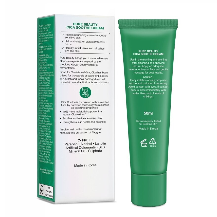 Pure Beauty Cica Soothe Cream is Intense nourishing cream to soothe sensitive skin. Helps strengthen skin's protective barrier. Rapidly moisturises and refreshes dry, dull skin. Pure Beauty brings you a remarkable new skincare experience inspired by the precious Korean beauty secret of fermentation. Short for Centella Asiatica, Cica has been prized for thousands of years for its ability to nourish and repair damaged skin with powerful natural antioxidants and nutrients. Cica Soothe is formulated with termented. Cica by patented technology to maximise its treasured properties. 40 more moisturising power than.Promote paper packaging made with paper from responsibly managed forests, or with recycled content. Additionally, the paper used in this packaging is certified by FSC.