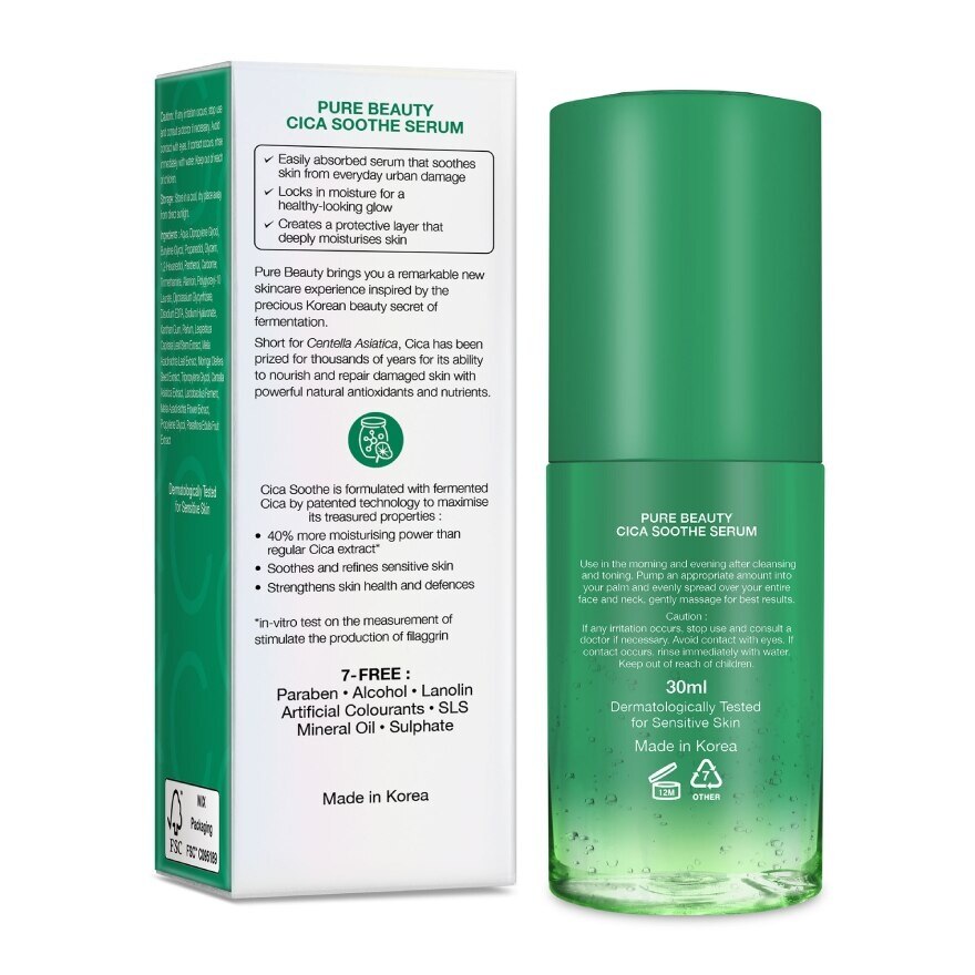Pure Beauty Cica Soothe Serum. Easily absorbed serum that soothes skin from everyday urban damage. Locks in moisture for a healthy-looking flow. Creates a protective layer that deeply moistures skin. Pure Beauty brings you a remarkable new skincare experience inspired by the precious Korean beauty secret of fermentation. Short for Centella Asiatica, Cica has been prized for thousands of years for its ability to nourish and repair damaged skin with powerful natural antioxidants and nutrients. Cica Soothe is formulated with termented. Cica by patented technology to maximise its treasured properties. 40 more moisturising power than. Promote paper packaging made with paper from responsibly managed forests, or with recycled content. Additionally, the paper used in this packaging is certified by FSC.