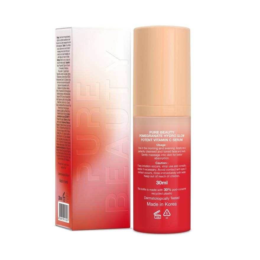 The Pure Beauty story begins with extracts of Korea’s finest natural ingredient. By applying Korean ingredient technology, these nutrients are refined and supercharged, intensifying their purity, potency, and efficacy. Unlock the secret to radiance and hydration with the Pure Beauty Pomegranate Hydro Glow range of skincare products. Formulated to energise and revitalise your skin, the range is supercharged with Korean Fermentation Techology to delivery over 60% more radiance and antioxidant power than regular pomegranate extract. This Pure Beauty Pomegranate Hydro Glow Potent Vitamin C Serum 30 ml is light weight serum harnesses the power of Korea’s finest natural ingredient to deliver 48 hour long lasting hydration for a radiant complexion and a healthy glow from within. It help to boost your skin’s natural defences to help maintain an even skin tone. 91% user satisfied with 48 hours long-lasting hydrating effect with 60 people. Test Laboratory : Eurofins Food Testing Service (Shanghai) Co., Ltd. In-vivo test on antioxidant evaluation. Dermatologically Tested. Free from Paraben Lanolin Alcohol.