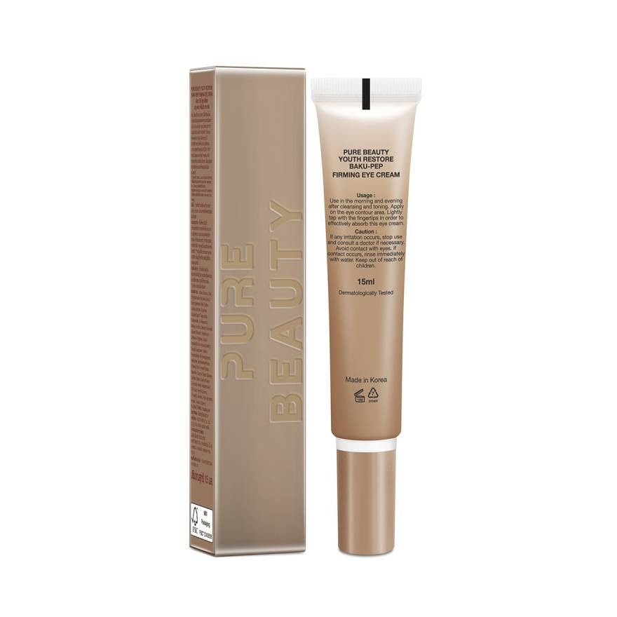 Pure Beauty Youth Restore Baku-Pep Firming Eye Cream. This rich cream helps to provide preventative care of aging concern and minimize puffiness to reduce sign of fatigue. It deeply hydrate, smooths and reduce fine lines, wrinkles and dark circle around eye area with younger-looking eyes. This product was formulated without over 20 unwanted ingredients & The paper used in this packaging is certified by FSC & bottle is made with 30% recycled plastic.