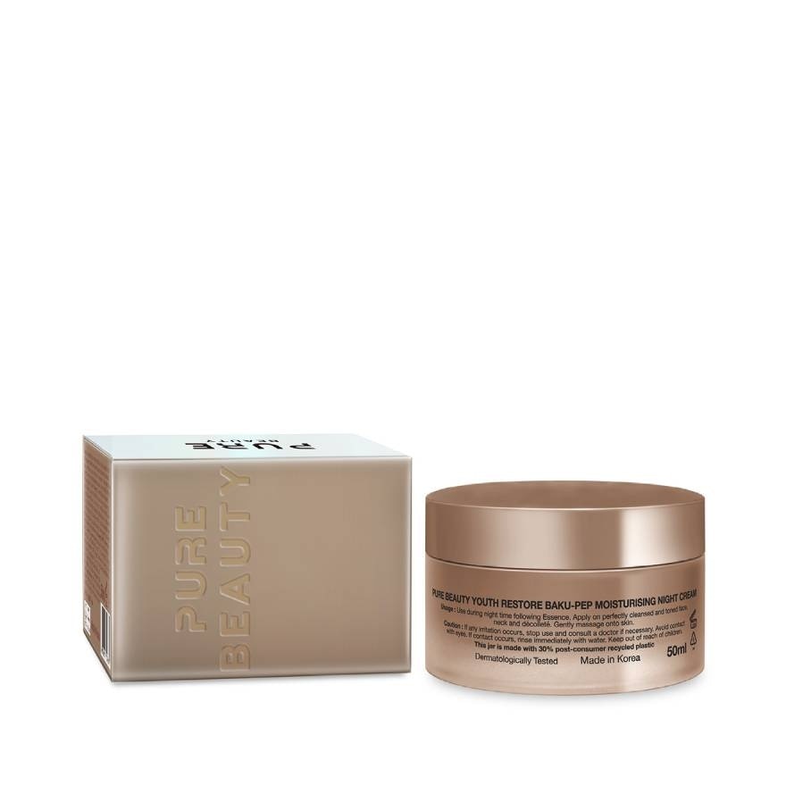 Pure Beauty Youth Restore Baku-Pep Moisturising Night Cream preserves youthfully firm and even looking skin tone. With peptide and bakuchiol to lesser signs of aging while helps to reduce wrinkle. This product was formulated without over 20 unwanted ingredients amp; The paper used in this packaging is certified by FSC amp; bottle is made with 30 recycled plastic.
