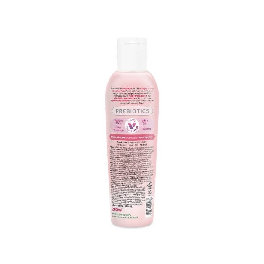 Pure'n Soft Sensitive Pro Feminine Wash is hypoallergenic formula for Sensitive Skin. Infused with Prebiotics and the unique V-care complex Plus, pampers and protects your delicate intimate area. Its mild formulation helps eliminate bad odours while protecting against discomfort during your special days to keep you fresh and clean. Free from Paraben, SLS, SLES, Colourants, Soap, MIT and Alcohol.Promote a reduced usage of virgin materials by using recycled content instead.The bottle is made with 24 Post-Consumer Recycled plastic.