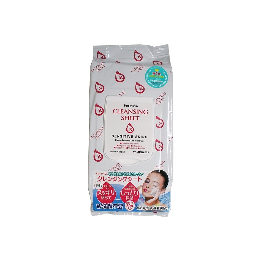 Purevivi Cleansing Sheet is a makeup remover and skin moisturizer in one step. Oil-free, color-free, fragrance-free, alcohol-free, paraben-free and no cat-ion. Suitable for sensitive skin and easy to use. Packed with 12 natural ingredients also Aloe-vera and Hyarulon. Guarantee with No.1 cleansing sheet from Cosme.