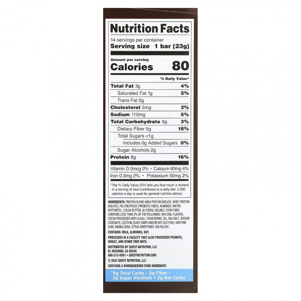 Смесь белков (изолят молочного протеина, изолят сывороточного протеина), полидекстроза (пребиотическая клетчатка), миндаль, вода, эритритол, какао-масло, глицерин, растворимая кукурузная клетчатка. Содержит менее 2% следующих ингредиентов: натуральные ароматизаторы, обработанное щелочью какао, пальмоядровое масло, соль, казеинат натрия, подсолнечный лецитин, ксантановая камедь, пищевая сода, подсластитель из стевии, сукралоза.