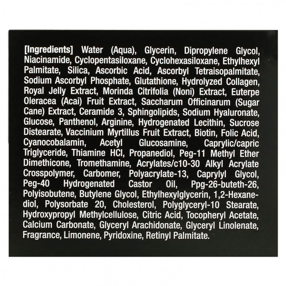 вода (Aqua), глицерин, дипропиленгликоль, никотинамид, циклопентасилоксан, циклогексасилоксан, Этилгексил пальмитат, диоксид кремния, аскорбиновая кислота, Аскорбил тетраизопальмитат, аскорбил фосфат натрия, Глутатион, Гидролизованный коллаген, экстракт маточного молочка, Экстракт нони (Morinda Citrifolia), экстракт ягод асаи (Euterpe oleracea), экстракт сахарного тростника (Saccharum officinarum), Керамид 3, Сфинголипиды, гиалуронат натрия, глюкоза, пантенол, Аргинин, гидрогенизированный лецитин, Дистеарат сахарозы, Экстракт плодов оспы (Vaccinium myrtillus), Биотин, Фолиевая кислота, Цианокобаламин, Ацетил глюкозамин, Каприловый / каприновый триглицерид, Тиамин гидрохлорид, пропандиол, ПЭГ-11 метиловый эфир диметикон, трометамин, Акрилаты / c10-30 алкилакрилатный кроссполимер, карбомер, полиакрилат-13, каприлилгликоль, ПЭГ-40 гидрогенизированное касторовое масло, ППГ-26-бутет-26, полиизобутен, бутиленгликоль, этилгексилглицерин, 1,2-гександиол, полисорбат 20, Холестерин, Полиглицерил-10 стеарат, гидроксипропилметилцеллюлоза, лимонная кислота, токоферилацетат, карбонат кальция, Глицерил арахидонат, Глицерил линоленат, отдушка, лимонен, Пиридоксин, Ретинилпальмитат.