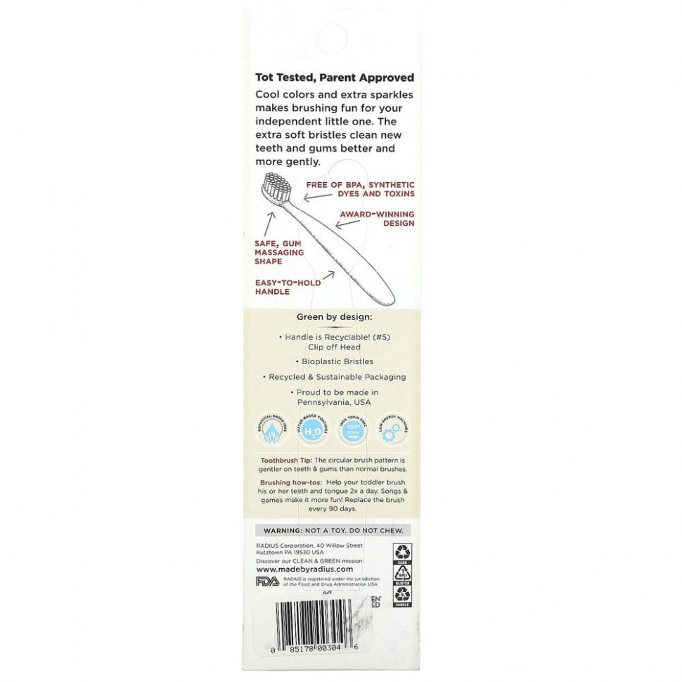 Веселые цвета и блестки превратят чистку зубов в забавное занятие для вашего самостоятельного крохи. Сверхмягкая щетина лучше и мягче очищает новые зубки и десны.