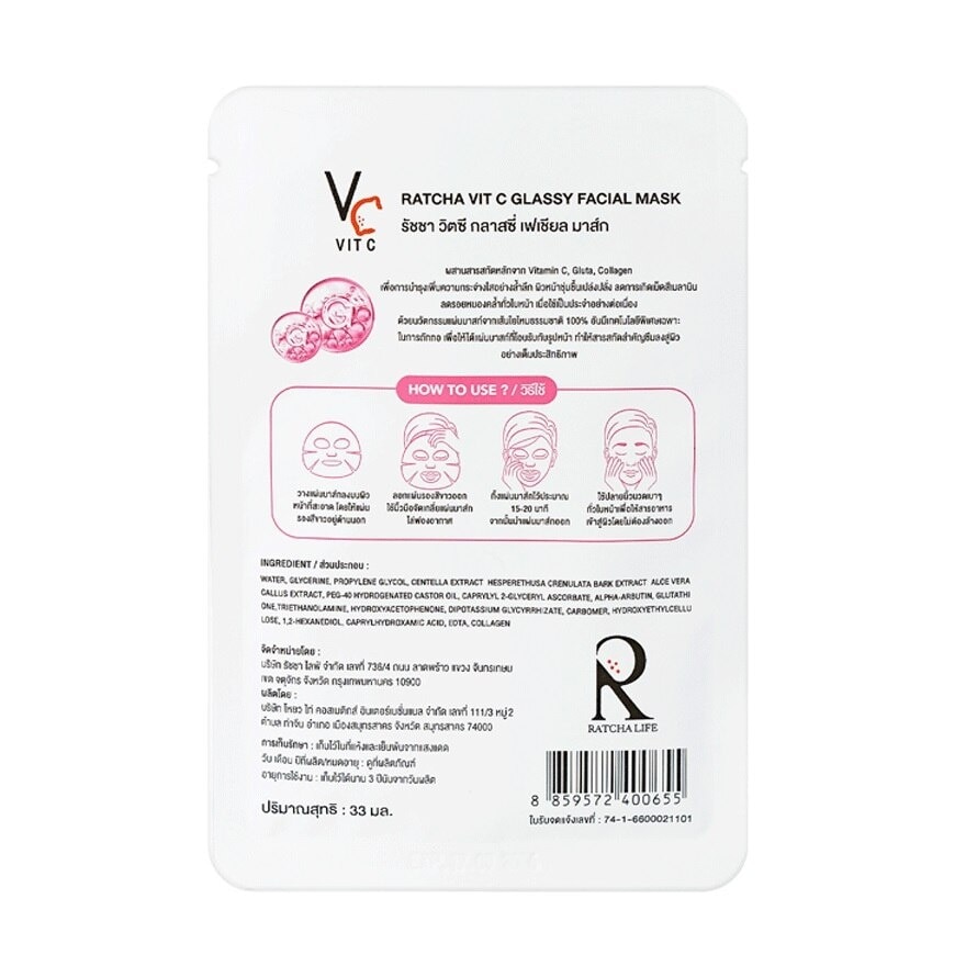 Ratcha Vit C Glassy Facial Mask A mask that combines main extracts from Vitamin C, Gluta, Collagen for facial skin care. Deeply increases radiance Facial skin will be moisturized and radiant. Reduce pigmentation Dark circles on the face When used regularly and continuously With an innovative mask sheet made from 100% natural silk fibers, which has a special weaving technology to get a mask sheet that hugs the shape of the face. Makes important extracts absorb into the skin. at full efficiency. Place the mask on clean face. With the white backing on the outside. Peel off the white backing. Use your fingers to spread out the mask to remove air bubbles. Leave the mask on for 15-20 minutes, then remove the mask. Use your fingertips to gently massage. all over the face to allow nutrients to enter the skin without washing off.