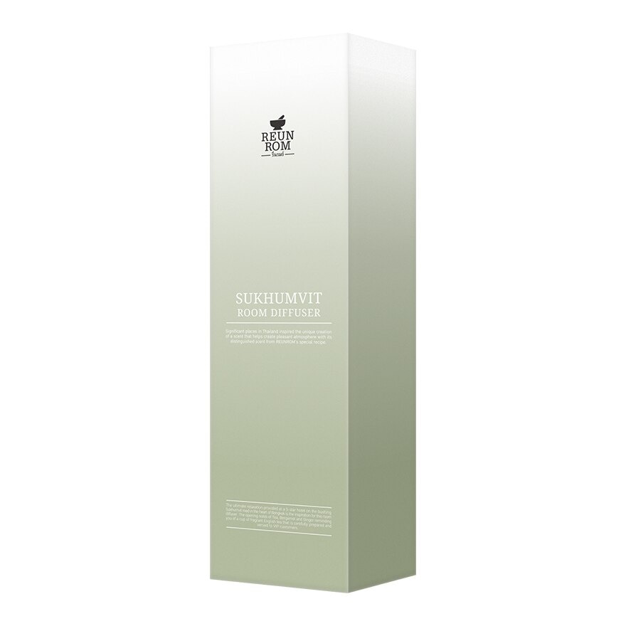 Reunrom Room Diffuser 30ml Sukhumvit The ultimate relaxation provided at a 5 star hotel on the bustling Sukhumvit road in the heart of Bangkok is the inspiration for this room diffuser The opening notes of Tea Bergamot Lemon Orange and Ginger fuses with luxurious and delicate scent of Rose Gardenia Geranium Jasmine Nutmeg and Ylang Ylang before giving way to sweet notes of Sage and Honey It finishes with clean crisp notes of Musk Cedarwood Saffron and Amber reminding you of a cup of fragrant English tea that is carefully prepared and served to VIP customers