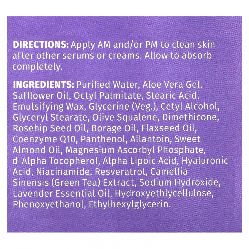 Очищенная вода, гель алоэ вера, сафлоровое масло, октил пальмитат, стеариновая кислота, воск эмульгированный, глицерин (растительный), цетиловый спирт, глицерил стеарат, оливковый сквален, диметикон, масло из семян шиповника, масло бурачника, льняное масло, коэнзим Q10, пантенол, аллантоин, масло сладкого миндаля, аскорбилфосфат магния, d-альфа токоферол, альфа-липоевая кислота, гиалуроновая кислота, никотинамид, ресвератрол, экстракт зеленого чая (Camellia sinensis), гидроксид натрия, лавандовое эфирное масло, гидроксиэтицеллюлоза, феноксиэтанол, этилгексилглицерин.