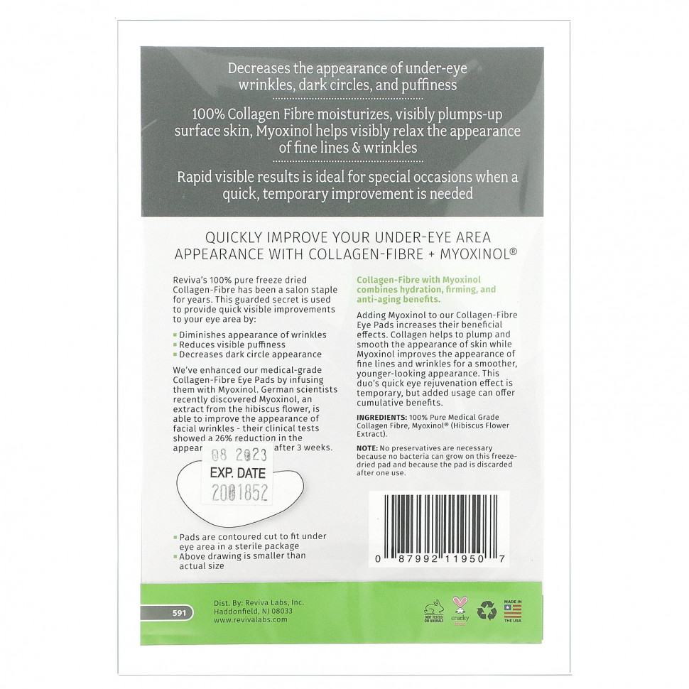 100% чистое сублимированная коллагеновая клетчатка от Reviva уже много лет используется в салонах красоты. Этот тщательно охраняемый секрет помогает быстро улучшить состояние кожи вокруг глаз.