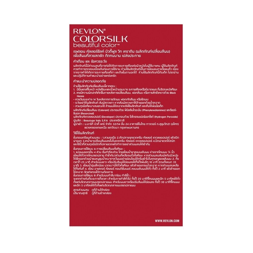 Revlon Colorsilk Beautiful Color With Keratin No.48 Burgundy Revlon Colorsilk Hair Color Beautiful Color Ammonia-Free, Leave hair in better condition with UV Defense 100 Gray Coverage , Permanent Color. Infused with nourishing silk proteins so your hair looks silker, shinier and healthier. UV Defense helps prevent fading ad sun damage. 1. Put on coloring gloves.Snip off tip of Developer(1) 2. Pour the Colorant(2) into the developer bottle(1) and shake vigorously until the mixture is blended. 3. Apply to dry hair. Leave on for 25 minutes. 4. Add warm water to hair and gently massage mixture throughout. Apply the conditioner and leave ob for 2 minutes. Rinse thoroughly with warm.