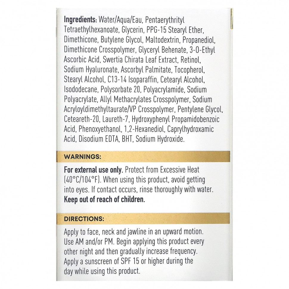 Water/aqua/eau, pentaerythrityl tetraethylhexanoate, glycerin, ppg-15 stearyl ether, dimethicone, butylene glycol, maltodextrin, propanediol, dimethicone crosspolymer, glyceryl behenate, 3-0-ethyl ascorbic acid, swertia chirata leaf extract, retinol, sodium hyaluronate, ascorbyl palmitate, tocopherol, stearyl alcohol, c13-14 isoparaffin, cetearyl alcohol, isododecane, polysorbate 20, polyacrylamide, sodium polyacrylate, allyl methacrylates crosspolymer, sodium acryloyldimethyltaurate/vp crosspolymer, pentylene glycol, ceteareth-20, laureth-7, hydroxyphenyl propamidobenzoic acid, phenoxyethanol, 1,2-hexanediol, caprylhydroxamic acid, disodium edta, bht, sodium hydroxide.