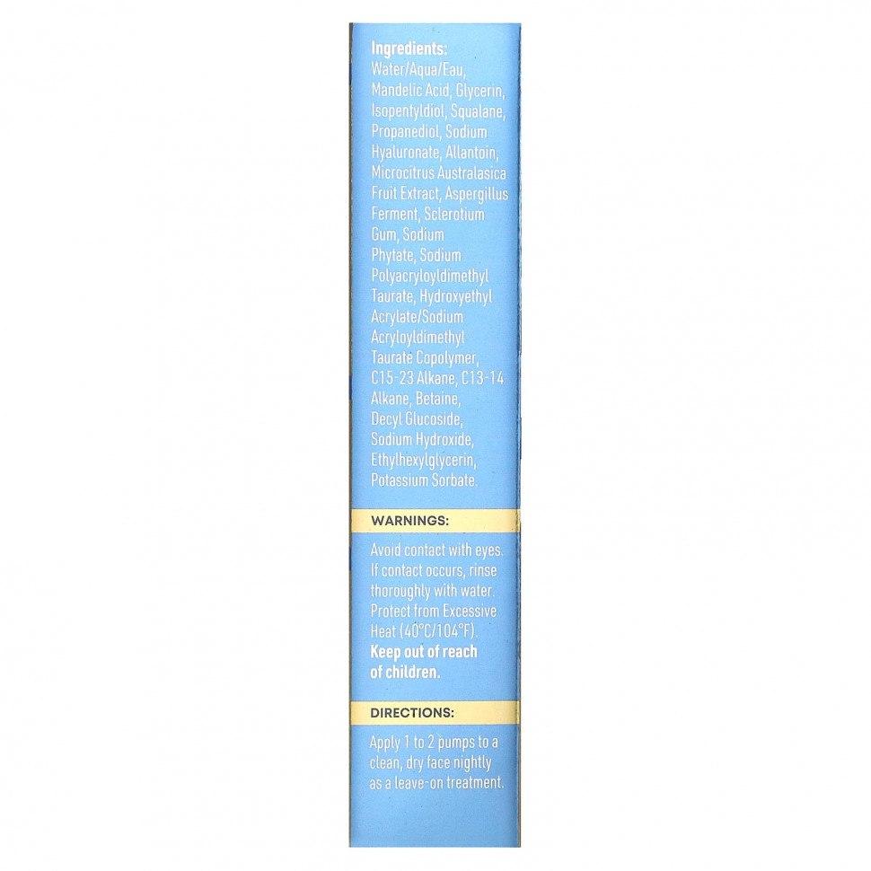 Water/aqua/eau, mandelic acid, glycerin, isopentyldiol, squalane, propanediol, sodium hyaluronate, allantoin, microcitrus australasica fruit extract, aspergillus ferment, sclerotium gum, sodium phytate, sodium polyacryloyldimethyl taurate, hydroxyethyl acrylate/sodium acryloyldimethyl taurate copolymer, c15-23 alkane, c13-14 alkane, betaine, decyl glucoside, sodium hydroxide, ethylhexylglycerin, potassium sorbate.