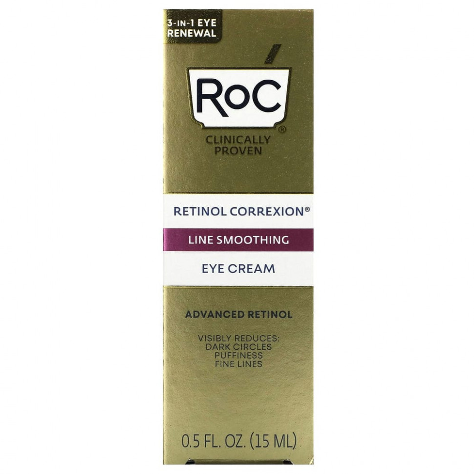 Устраните 3 признака старения глаз: отечность, темные круги и морщины с помощью крема для кожи вокруг глаз RoC® Retinol Correxion®. Клинически доказано, что средство заметно омолаживает кожу вокруг глаз. Наша формула, изготовленная из чистого ретинола RoC® и нашего эксклюзивного минерального комплекса, является мощной, но достаточно мягкой, чтобы наносить ее на нежную кожу вокруг глаз. Протестировано дерматологами.