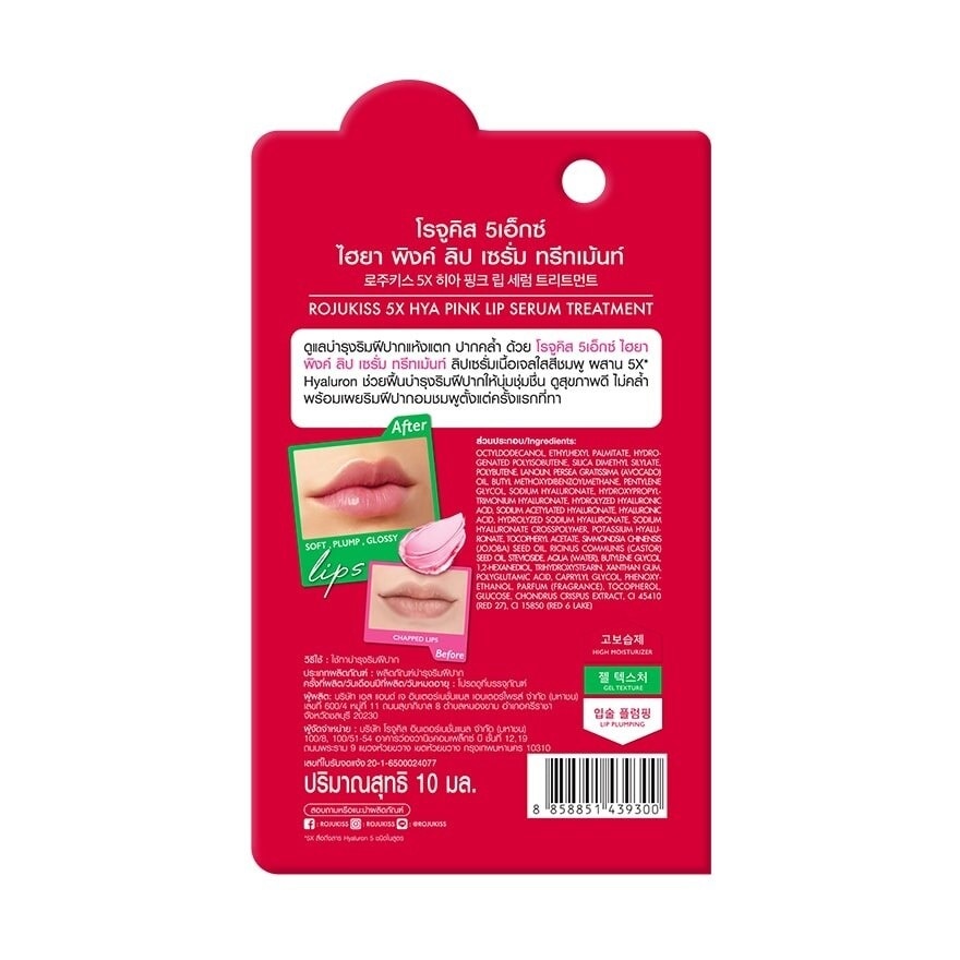 Rojukiss 5X Hya Pink Lip Serum Treatment From our successful best-selling Rojukiss Sheet Mask with the first time of this lip serum from Korea. Say goodbye to dry, dark color lips with Rojukiss 5X Hya Pink Lip Serum Treatment. It comes with soft gel texture which is infused with 5X intensive Hyaluron that deeply moisturized and nourished your dry, cracked, and dull lips while add a light pink color on your lips. It gently exfoliates the dead skin and reveal your lips to be soft, smooth, and fully moisturized for everyday use. Dermatological Tested.