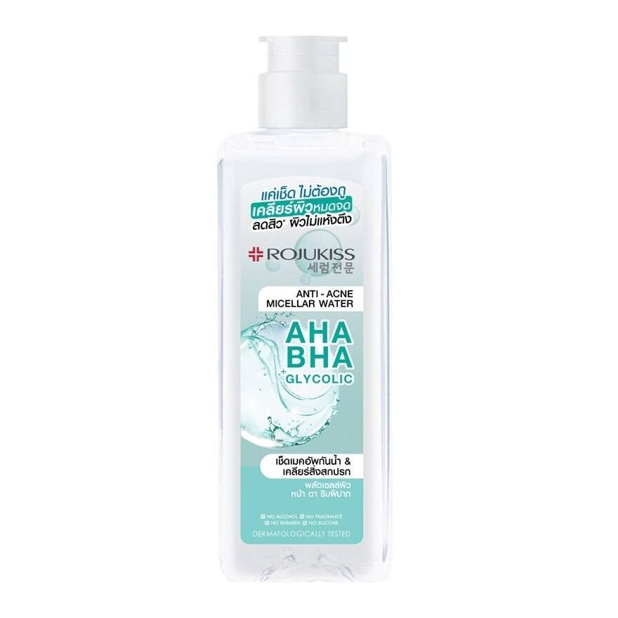 Rojukiss AHA + BHA Glycolic Anti-Acne Micellar Water The product is designed to cleanse and remove waterproof makeup effortlessly with a water-based texture. Simply wipe, no need to rub. Clears away all residues on the face, eyes, and lips completely. Restore and nourish the skin to be acne-prone. Enriched with a blend of AHA + BHA and GLYCOLIC, it helps in reducing acne, preventing bacterial accumulation, unclogging pores, exfoliating skin cells for a smooth and clear complexion, tightening pores, and strengthening the skin, thus reducing the likelihood of acne. Additionally, it replenishes moisture to keep the skin hydrated, soothes, and prevents dryness. Dermatologically Tested Free from Alcohol, Fragrance, Paraben, Silicone, Sulfate, Mineral oil, and Synthetic color.