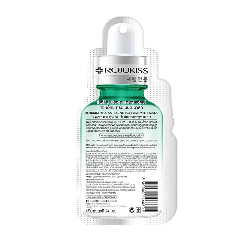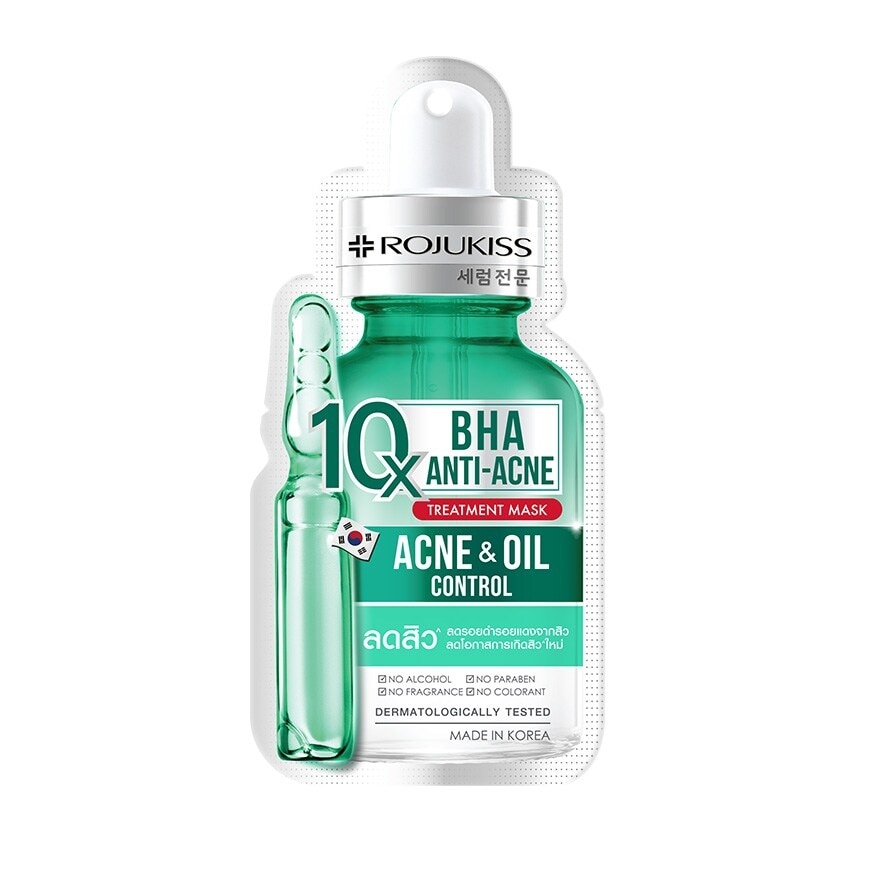 Rojukiss BHA Anti-Acne 10X Treatment Mask The 10 times concentrated facial treatment mask, containing BHA that deeply penetrates and targets acne, aiding in skin cell turnover while reducing the appearance of dark spots and redness from past acne.