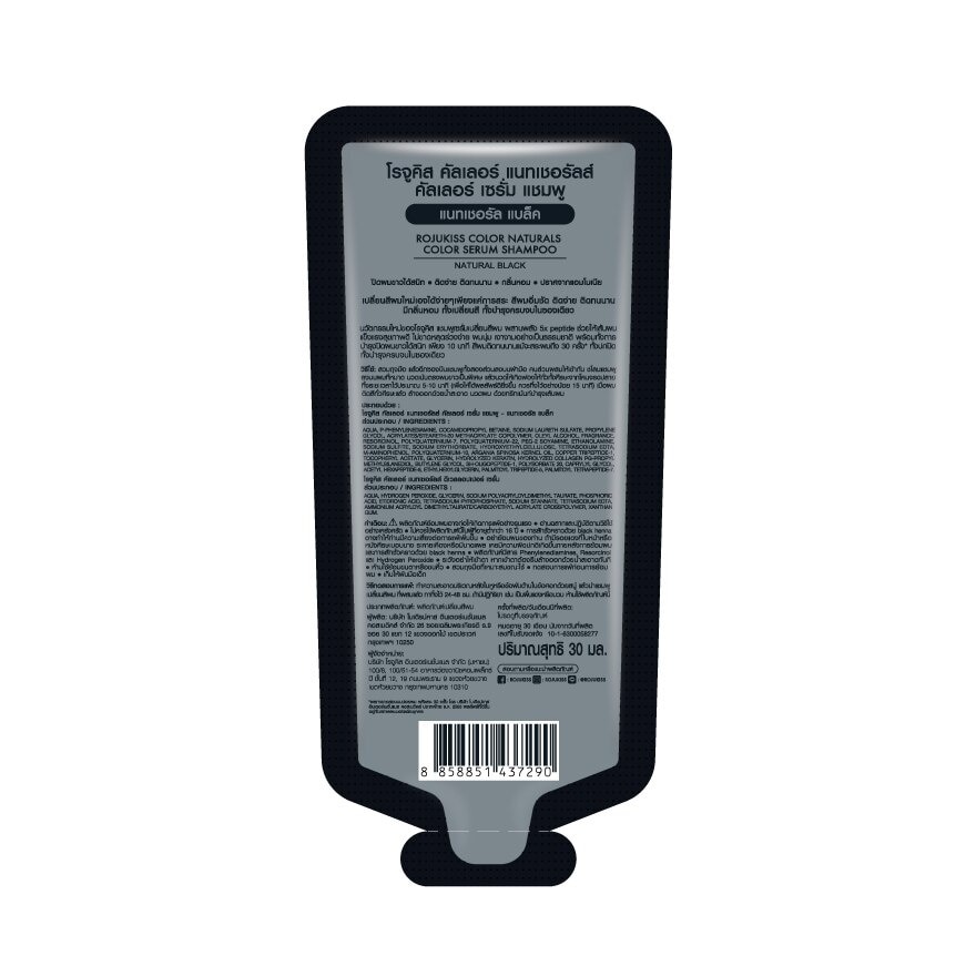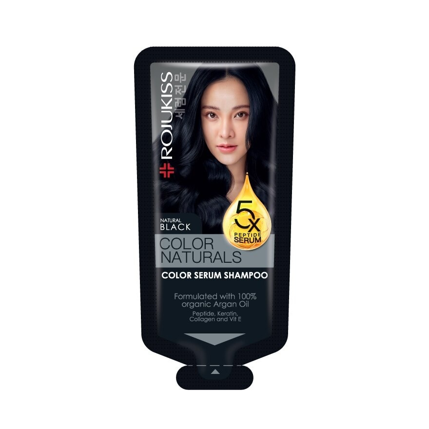 Rojukiss Color Naturals Serum Shampoo Natural Black Coverage grey hair — Long lasting — Good scent — Non Ammonia You can easily change the new hair color on your own just by washing. Our color serum shampoo is an intense color with a clear serum, easy to apply and long-lasting. the scent is good and changes color. Both shampoo serum and developer are in one sachet. The new innovation Rojukis Color naturals color serum shampoo combines the power of 5x peptide serum to keep hair healthy, not easy to fall off, and soft and shiny. With the ultimate close the white and grey hair completely in 10 minutes, long-lasting hair color that lasts even after washing your hair up to 30 times, both covering and nourishing, All in One Sachet Have 100% Organic ingredient with Non Ammonia.