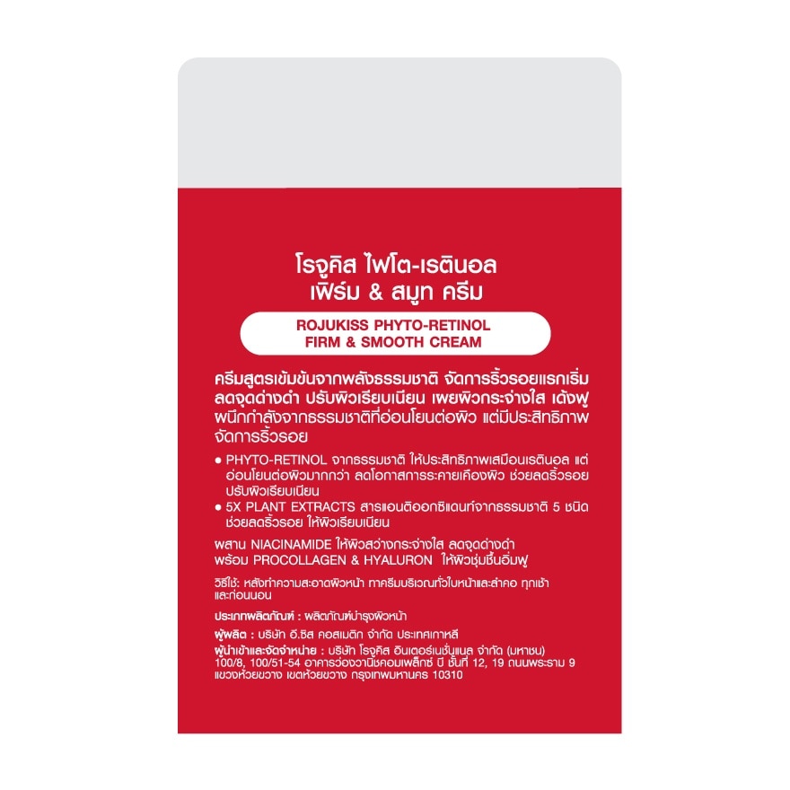 Rojukiss Phyto-Retinol Firm & Smooth Cream Intensive Natural Power Formula Cream. Help tackles early signs of Aging, Reduces Dark Spots, Smoothens Skin. Reveals Radiant and Plump Skin. Harnessing the gentle yet effective power of nature to combat wrinkles: — PHYTO-RETINOL: A natural ingredient that offers retinol-like efficacy but is gentler on the skin, reducing the risk of irritation. It helps diminish wrinkles and smoothens the skin. — 5X PLANT EXTRACTS: Five types of natural antioxidants that help reduce wrinkles and smoothen the skin. — NIACINAMIDE: Brightens the skin and reduces dark spots. — PROCOLLAGEN & HYALURON: Hydrates and plumps the skin. — Dermatologically tested for irritation, gentle even for sensitive skin. — No Paraben, No Alcohol, No Fragrance, No Colorant After cleansing your face, apply the cream all over your face and neck every morning and night.