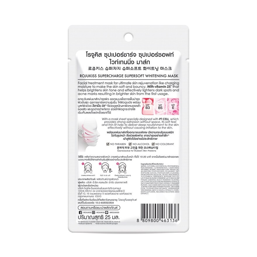 Rojukiss Supercharge Supersoft Whitening Mask Facial treatment mask for ultimate skin rejuvenation like charging moisture to make the skin soft and bouncy. With vitamin 3X that helps brightens skin tone and effectively lightens dark spots and acne marks resulting in brighter skin from the first usage. With a mask sheet specially designed with PT CELL, which provides strong adhesion without space and transparent compared with similar materials. Effective lifting because the formulation softens when absorbed, and natural shrinkage occurs when dried. Simply attaching makes skin elastic. Its soft feel and thin fit help to deliver deep nourishment to the skin effectively without causing irritation to the skin.