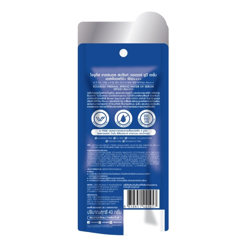 Rojukiss Thermal Spring Water UV Serum SPF50+ PA++++, a superlight touched, invisible, weightless, water-like feel facial sunscreen that provides full broad spectrum SPF50+ PA++++ protection against UVA-I, UVA-II and UVB. Enriched with vitamin and mineral from korean thermal spring water, Collagen and Hyaluron which helps restore dry, dehydrated skin and restore moisture to the skin. Suitable for all skin types. Dermatologically tested. Reef friendly. 5-Free formula — PARABEN, ALCOHOL , FRAGRANCE, OIL, COLORANT