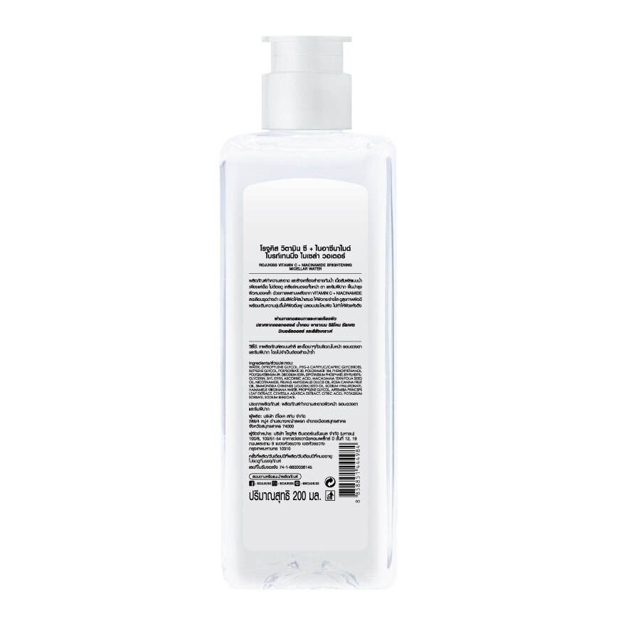 Rojukiss Vitamin C + Niacinamide Brightening Micellar Water The product is designed to cleanse and remove waterproof makeup effortlessly with a water-based texture. Simply wipe, no need to rub. Clears away all residues on the face, eyes, and lips completely. Restore and nourish dark spots on the skin with the power of VITAMIN C + NIACINAMIDE, reducing the appearance of dark spots, evening out skin tone, providing radiant and healthy-looking skin. Additionally, it moisturizes the skin, providing hydration and soothing without causing dryness. Apply the product onto a cotton pad and gently wipe all over the face, around the eyes, and the lips without the need for rinsing with water afterward. Dermatologically Tested Free from Alcohol, Fragrance, Paraben, Silicone, Sulfate, Mineral oil, and Synthetic color.