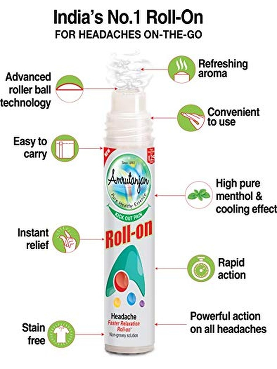 Ролик-ингалятор Амрутанджан Roll On облегчает головную боль, а так же боль при растяжениях, вывихах и ушибах, помогает при воспалительных и ревматических заболеваниях суставов.
