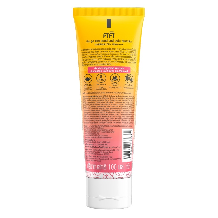 Sun Cool Face amp; Body Serum Sunscreen SPF50+ PA++++ Serum Sunscreen that calming and soothing your skin from the heat. Serum sunscreen with lightweight texture easy to spread absorbs quickly can be used for both face and body. Calming and soothing your skin from the heat from Water Lily Flower Extract and HSFC Encapsulation Technology giving your skin a fresh and relaxing feeling Helps protect the skin from sunlight from both UVA and UVB through Triple Sun Protection SPF50 PA++++ while also protecting your skin from blue light and pullution through Marine Bamboo and Pollushield technology. Triple sun protection protects the skin from sunlight by 3 mechanisms in one HYA 8X Moisturizes the skin with 8 molecules of hyaluronic acid White pine aurora brighten the look of skin and dark spots