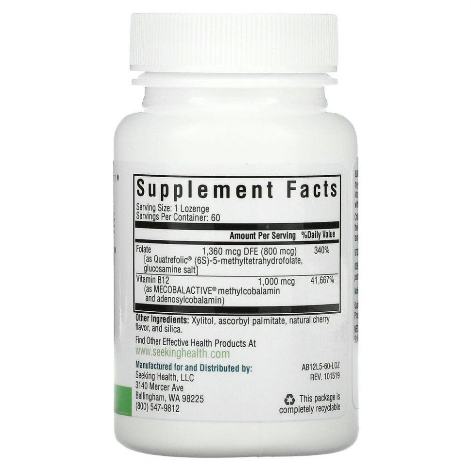 Пастилки с активным витамином B12 и L-5-MTHF от Seeking Health содержат 1360 мкг DFE (800 мкг) чистого нерацемического L-метилфолата в удобной для использования форме, а также две активные «коферментные» формы витамина B12. В качестве «коферментных» форм метилкобаламин и аденозилкобаламин являются формами, необходимыми для определенных B12-зависимых ферментов и реакций в организме. Точно так же L-5-метилтетрагидрофолат считается «активной» формой фолиевой кислоты — наиболее распространенной формой фолата в плазме крови.