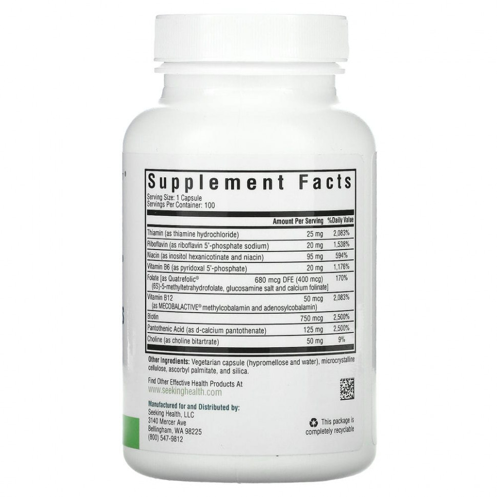 B Complex Plus от Seeking Health содержит восемь витаминов группы B с активными формами фолиевой кислоты, витамина B12, рибофлавина и B6. Этот комплекс также содержит холин, кофактор витаминов группы B, для оптимального усвоения. Активная форма фолата, L-5-метилтетрагидрофолат (L-5-MTHF), включена для поддержки немедленного метаболического ответа по сравнению с синтетической фолиевой кислотой, которая обычно встречается в других добавках. L-5-MTHF особенно полезен для поддержки требований нервной системы, поскольку это единственная форма фолиевой кислоты, которая проникает через гематоэнцефалический барьер. Коферментные формы витамина B12 (метилкобаламин и аденозилкобаламин), используемые в этом комплексе, могут легко усваиваться и использоваться организмом, поскольку эти формы активно участвуют в важных B12-зависимых ферментных реакциях.