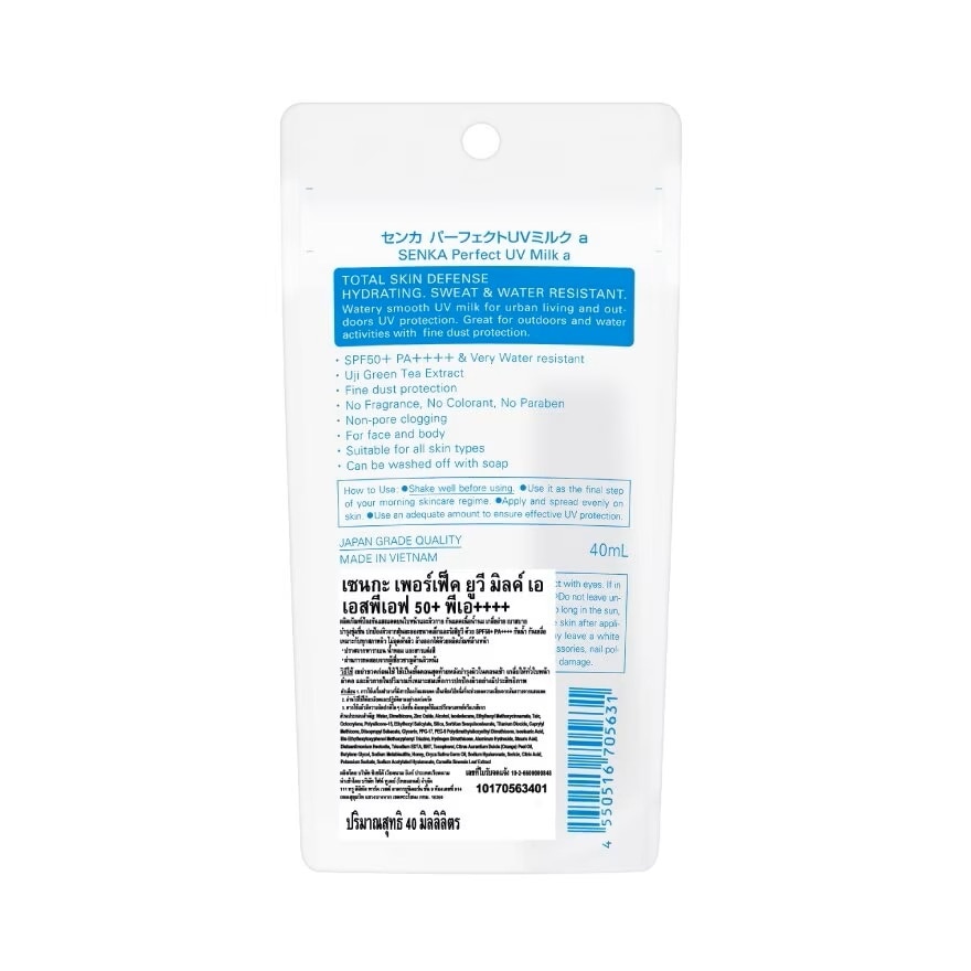 Senka Perfect UV Milk A SPF 50+ PA++++ with Watery smooth UV milk for urban living and out-doors UV protection with fine dust protection. TOTAL SKIN DEFENSE HYDRATING. SWEAT & WATER RESISTANT. — SPF50+ PA++++ & Very Water resistant — Photo-aging protect — Fine dust protection — Uji Green Tea Extract — Non-pore clogging — For face and body — Suitable for all skin types — Can be washed off with soap — No Fragrance, No Colorant, No Paraben — Dermatologist tested Senka Perfect UV Milk A SPF 50+ PA++++ with Watery smooth UV milk for urban living and out-doors UV protection with fine dust protection.