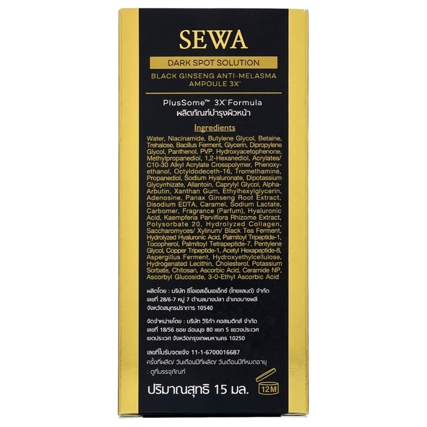 Sewa Dark Spot Solution Black Ginseng Anti-Melama Ampoule 3X The product with concentrated ampoule meat extracted from black ginseng. Rich in the value of revitalizing and nourishing the skin. Origin from Korea Strengthen your facial skin with the power of nature. Helps reduce dark spots. Blemishes and freckles caused by sunlight will appear faded. Helps soothe the skin Reduce wrinkles Provides moisture and radiance to the skin. Highly Effective Ginseng Anti-Melasma Brightness Skin Skin Penetration Improve Wrinkle amp; Elasticity. The product with concentrated ampoule meat extracted from black ginseng. Rich in the value of revitalizing and nourishing the skin. Origin from Korea Strengthen your facial skin with the power of nature. Helps reduce dark spots. Blemishes and freckles caused by sunlight will appear faded. Helps soothe the skin Reduce wrinkles Provides moisture and radiance to the skin.