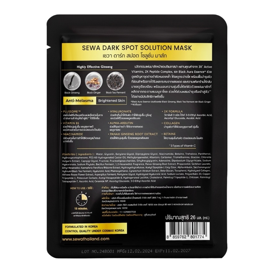 Innovative facial mask sheet combines effective ingredients from 3X Active Vitamins, 2X Peptide Complex and Black Aura Essence to correct dark spots and brighten skin tone from within. Restore skin damaged by sunlight, weak and dry skin to be soft, moist and smooth. Pores are tightened. Skin is full of water from the mask sheet made from charcoal paper, allowing nutrients to be absorbed into the skin more effectively. Whiten and brighten skin, reduce dark spots, acne scars, even skin tone, tighten pores, smooth skin, fine lines appear to fade, look younger.