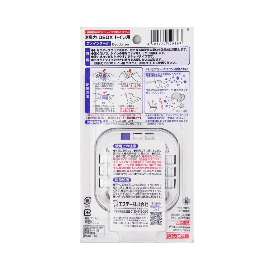 Shoshuriki DEOX for the bathroom with the innovative Receptor Blocking Deodorize that will help eliminate odors after defecation that are difficult to remove odors with just daily cleaning and with the current air fresheners on the market. With Shoshuriki DEOX products, you will no longer have to worry about odors in your daily life. Product usage, for deodorizer in toilet. Product Warnings, read the warnings or recommendations on the label before use. Shaldan Fragrance for cleaning the air with techology from Japan. Shaldan Shoshuriki Toilet Deodorizer Air Freshener.