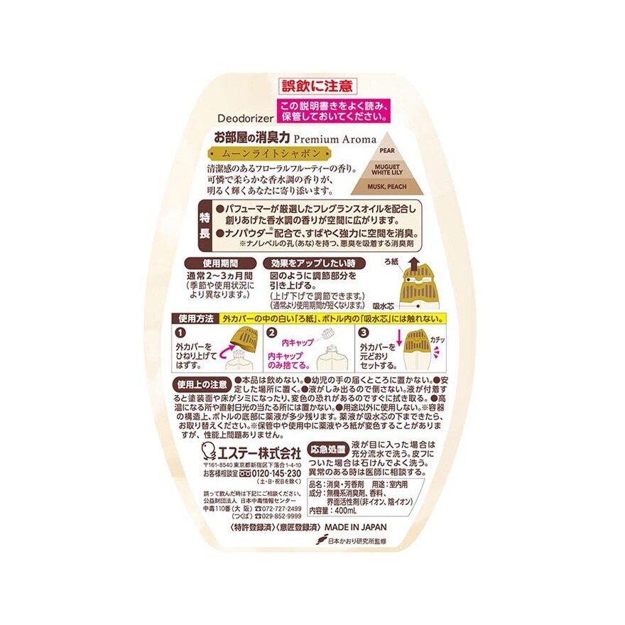 Moonlight Savon, the original scent used in the Suteki Plus series, a long-selling scent in Thailand. Used to adjust the scent formula to Premium Aroma series, For Room and Stick. Liquid type for the room contains NANO POWDER that helps to deodorize in the room to refresh. The stick type has a strong fragrance 5 times the For room liquid type. This intense scent feels and creates a better mood. Product usage, for deodorizer in room. Product Warnings, read the warnings or recommendations on the label before use. Shaldan Fragrance for cleaning the air with techology from Japan. Shaldan Shoshuriki Premium Aroma Air Freshener.