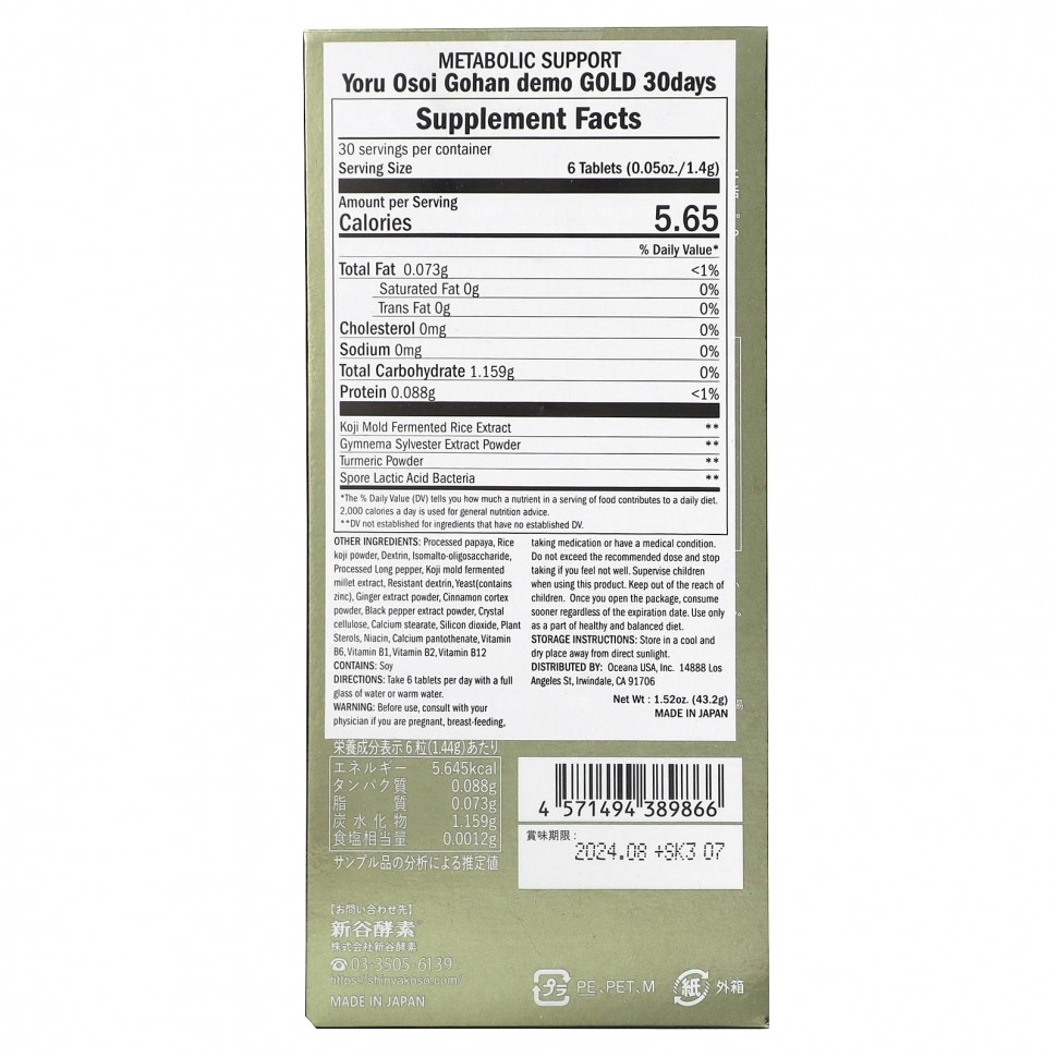 Обработанная папайя, рисовый кодзи, декстрин, изомальтоолигосахарид, обработанный длинный перец, экстракт ферментированного проса плесени коджи, устойчивый декстрин, дрожжи (содержит цинк), порошок экстракта имбиря, порошок коры головного мозга корицы, порошок экстракта черного перца, кристаллическая целлюлоза, стеарат кальция, диоксид кремния, растительные стеролы, ниацин, пантотенат кальция, витамин B6, витамин B1, витамин B2, витамин B12.