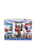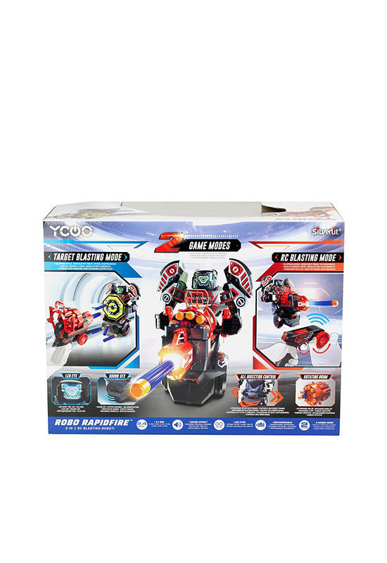 Meet the Rapidfire Robot, a 2-in-1 action robot with totally innovative gameplay. Robo Rapidfire is a 2-in-1 Remote Controlled Launch Robot! It has an LED face and its dynamic sound effects!