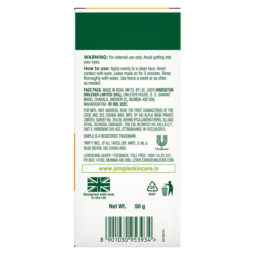 Simple Protect N Glow Vitamin C Range contains the most effective and stabilised form of Vitamin C making it the most advanced and potent range for naturally glowing and even skin. With the winning combination of Vitamin C and Niacinamide, it has one of the best products for naturally glowing, clear, and bright skin. Infused with Yuzu Lemon, Ginger, and 100% Bentonite Clay, Simple Vitamin C Brighten Clay Mask is proven to remove dust and impurities like a magnet by unclogging pores to reveal skin’s natural glow. With 3x blend of antioxidants, this brighten clay mask removes excess oil, sebum, and pollution for bright, fresh, and glowing skin. The added infusion of Glycerine and Ginger Root Juice gives this mask the dual benefit of removing dead cells and dark spots while leaving the skin hydrated and bright. Suitable for all skin types, even the most sensitive ones, this brighten clay mask helps to brighten, clear, and soften your skin without irritation. Simple Protect N Glow Vitamin C Brighten Clay Mask like all Simple products contains no colour or dye, no soap, and no artificial perfume. It is dermatologically tested and approved, and ophthalmologically tested. Specially designed for sensitive skin users, it is also hypoallergenic and non-comedogenic. This clay mask is also suitable for oily, dry and combination skin for both men and women. Non-Comodogenic Hypoallergenic Dermatologically Tested No-perfume Free from 2000+ harsh chemicals No-colour
