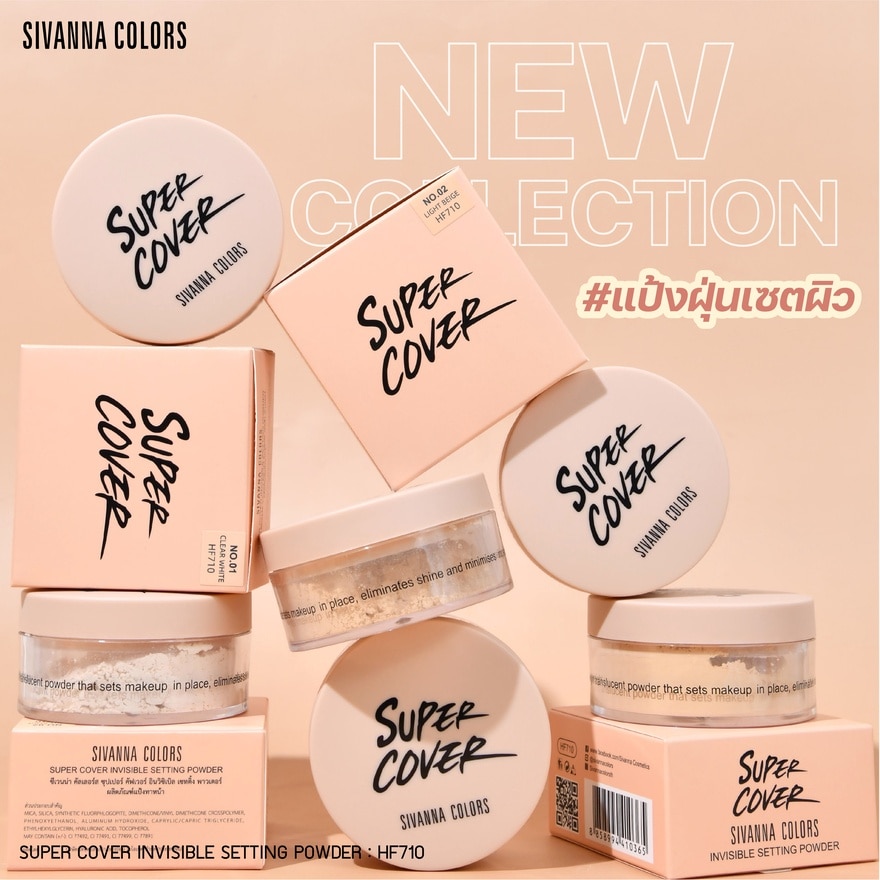 Sivanna Colors Super Cover Invisible Setting Powder: Loose Powder Which Is Lightweight And Fine Texture. Comes With A Soft Puff. Portable Package. Helps Blur Pores To Make The Face Look Smooth. Setting Makeup As Well. Adjusts Skin Tone To Be Even. Brightens And Naturally Clear. Controls Oiliness. And Adds Moisture To The Face. Suitable For All Skin Types. Can Be Filled More During The Day. Use A Puff To Tap Evenly Over The Face And Neck For A Flawless, Smooth Complexion With A Natural, Flawless Finish. Available 3 Shades. No.01 Clear Beige. No.02 Light Beige. No.03 Natural Beige. Package Size 20 g.
